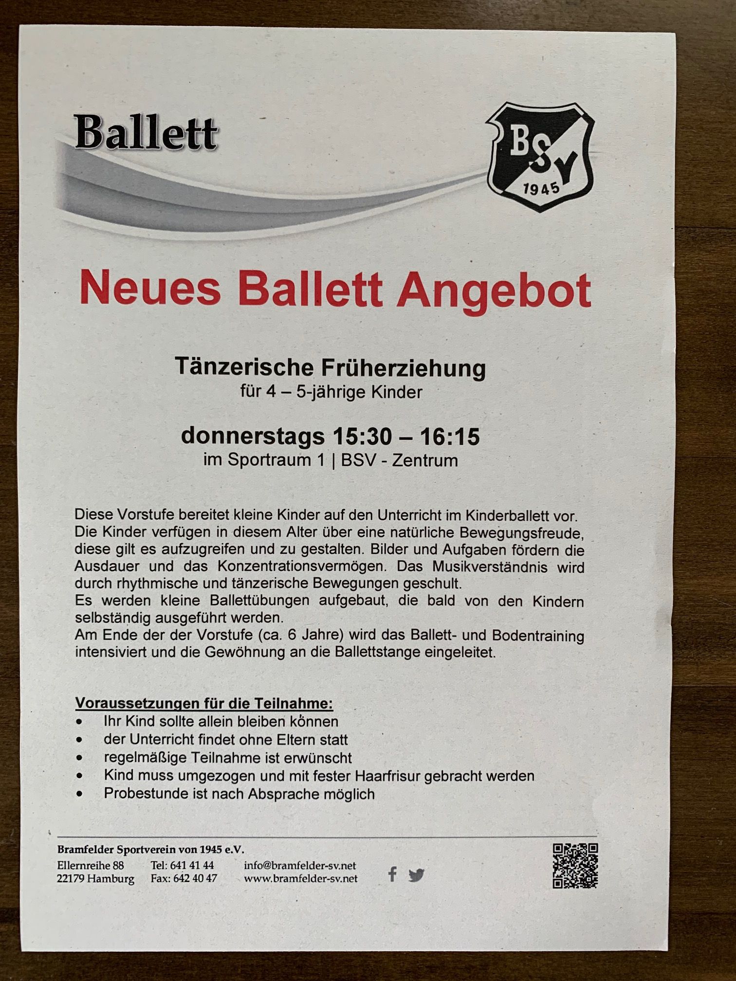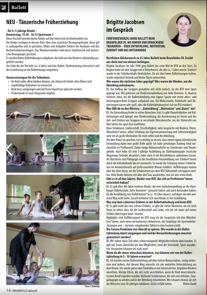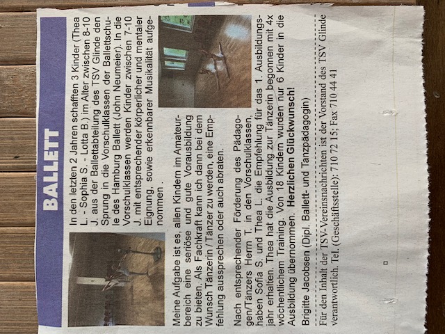 Ballettferien: Ostern: - Himmelfahrt: - Pfingsten: - Sommer: - Herbst: - Winter: - Presse Artikel über Tanz mit Handyicap im TSV Glinde Artikel über Aufnahme in Ballettschule des Hamburg Ballett (John Neumeier) |